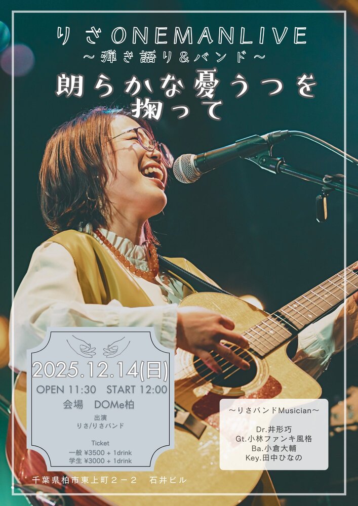 りさ弾き語り&バンドワンマンライブ 『朗らかな憂うつを掬って』 SCHEDULE 2025/12/14(日) 18:11 - 千葉県 DOMe柏 りさ弾き語り&バンドワンマンライブ 『朗らかな憂うつを掬って』 DOMe柏(千葉県柏市) OPEN 11:30/START 12:00 一般¥3500/学生¥3000 (+各1ワンドリク) チケット販売サイト URLをコピーする 報告する